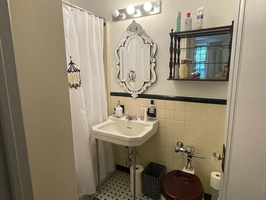 The en suite bathroom was cleaned up, given a new shower curtain, wooden toilet seat, area rug and mirror. The gut renovation of that bathroom will come in the fall, but for now, it sufficed after a good scrubbing.