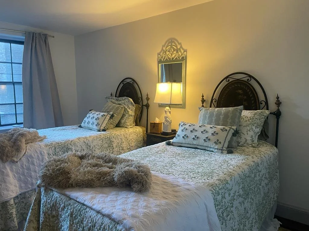 I purchased new bedding and ordered twin beds with frames, box springs and mattresses (something you hopefully won’t have to do. I also found a great night stand and mirror on Facebook Marketplace, ordered a full length mirror and a new area rug for her room. I repurposed a bureau that I had used as a tv stand in my previous residence. Honestly, it’s the nicest room in my home . . . so far!